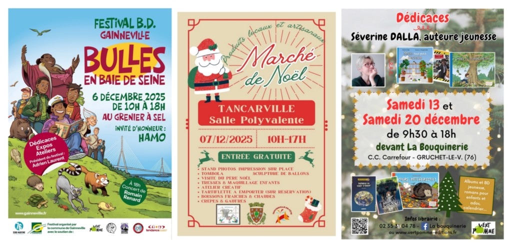 La rubrique Actualité liste mes dédicaces, disponible aussi sur le site de VERT POMME.